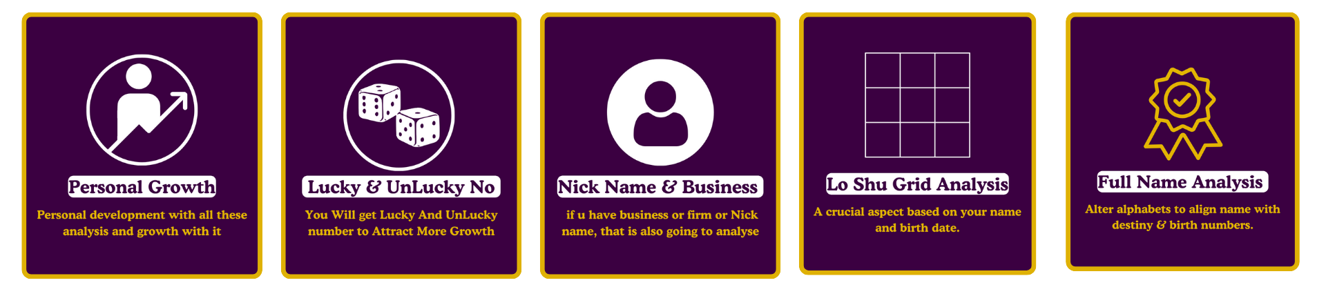Dive into a comprehensive analysis of personalities, communication styles, potential conflicts, and personalized tips for improving your Personality for growth and Success. It includes Main planets & Life Path number ,Calculate destiny number and name correction with optimised name options inside the report